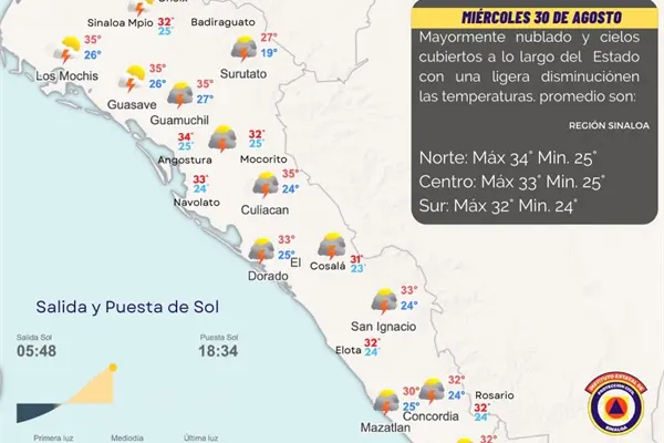Se prevén lluvias ligeras a moderadas para Sinaloa durante este miércoles 30 de agosto, informó el director de Protección Civil Municipal, Roy Navarrete Cuevas.