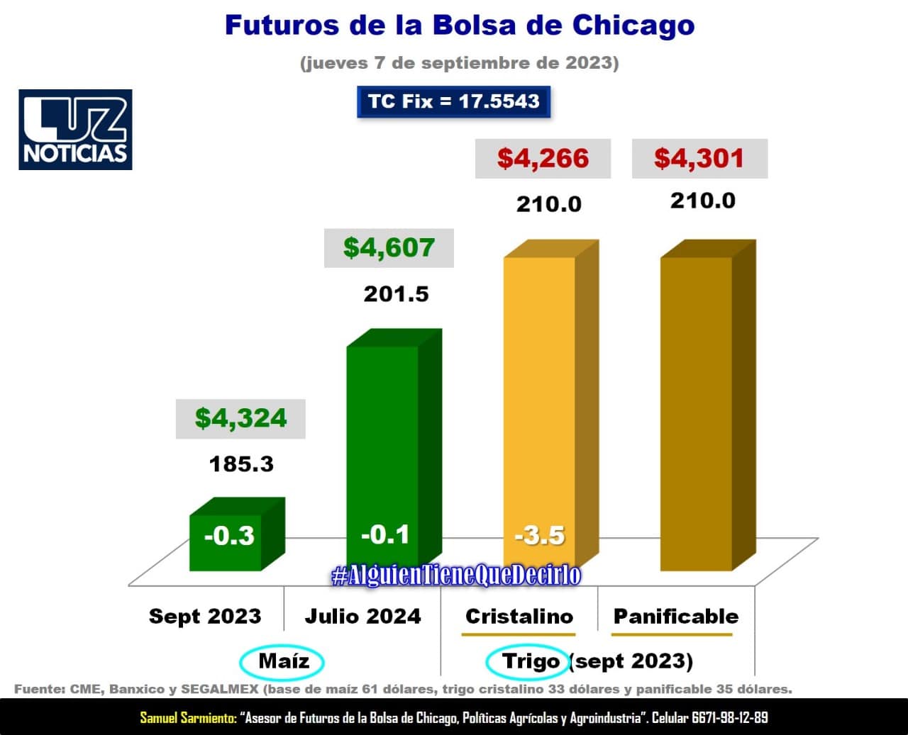 Por otro lado, los futuros del trigo con entrega en septiembre de 2023 disminuyeron en 3.5 dólares, estableciendo un precio de referencia de 4 mil 266 por tonelada de trigo cristalino y 4 mil 301 por tonelada de trigo panificable (teniendo en cuenta las BASES de 33 y 35 dólares propuestas por SEGALMEX para Sinaloa).