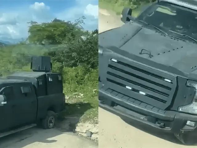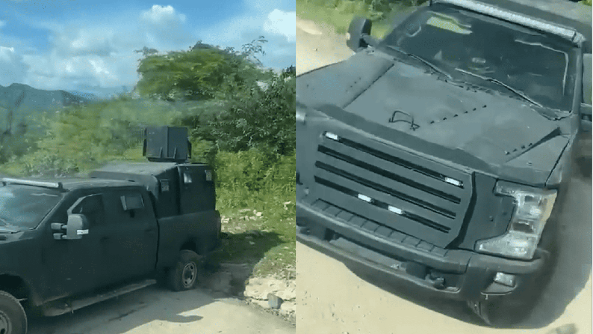 En las imágenes se puede apreciar cómo la camioneta está equipada para el manejo de armas de grueso calibre y que tiene las llantas traseras ponchadas, presuntamente por los impactos de bala.