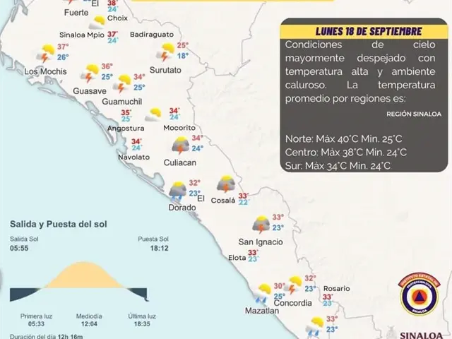 Protección Civil Sinaloa supone que las condiciones del cielo serán mayormente despejado con temperatura alta y ambiente caluroso. También especificó las temperaturas de cada región: