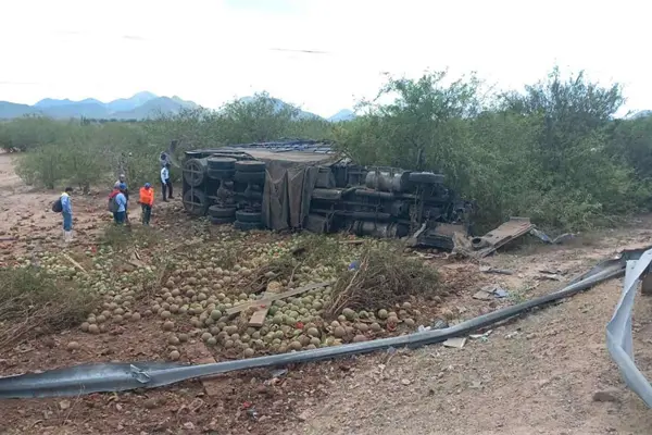 Tras salirse de la carpeta asfáltica, rompió la valla metálica de contención y luego el camión quedó volcado hacia un costado. En el accidente las sandías salieron de la caja y terminaron destrozadas.