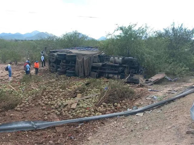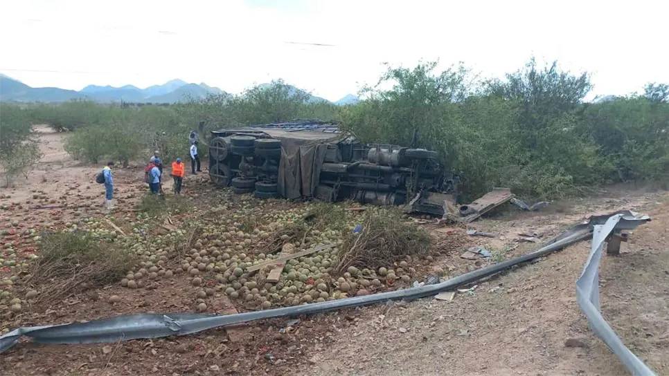 Un torton que salió del campo pesquero El Jitzámuri cargado con 17 toneladas de sandías, volcó esta tarde tras perder el control y salirse de la carpeta asfáltica en una pronunciada curva. Pese a lo aparatoso del accidente solo resultaron daños materiales; el operador de la unidad de carga sufrió solamente algunos raspones.
