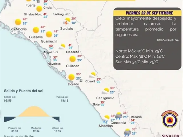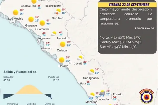 Protección Civil Sinaloa supone que durante este viernes habrá cielo mayormente despejado y ambiente caluroso. También especificó las temperaturas de cada región: