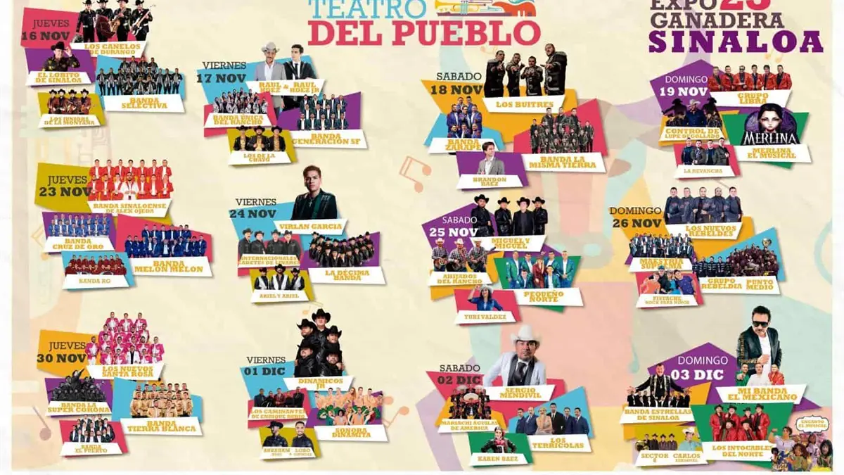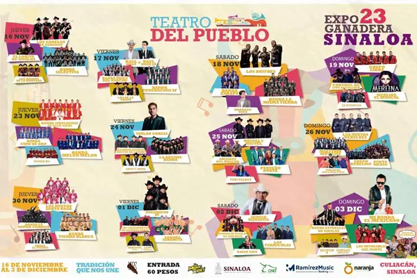 En esta cartelera del Teatro del Pueblo de la Feria Ganadera Culiacán destacan artistas como Banda Zarape, Los Canelos de Durango, Banda Estrellas de Sinaloa de Germán Lizárraga, Sonora Dinamita de Lucho Argaín, entre muchos más.