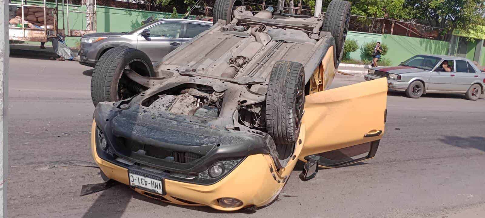 Un vehículo que era maniobrado por una mujer terminó volcado justo a la entrada del parque industrial Alfredo Bonfil, durante la tarde de este miércoles.