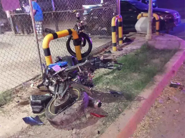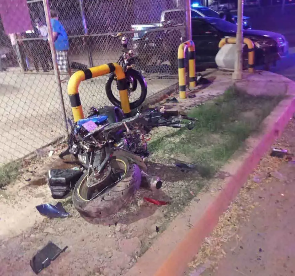 Debido a la velocidad y con el impacto, el vehículo se giró y consigo se llevó a la motocicleta, luego la impactó unas barras de contención de acero ubicadas afuera de una cerca de una gasera.