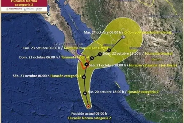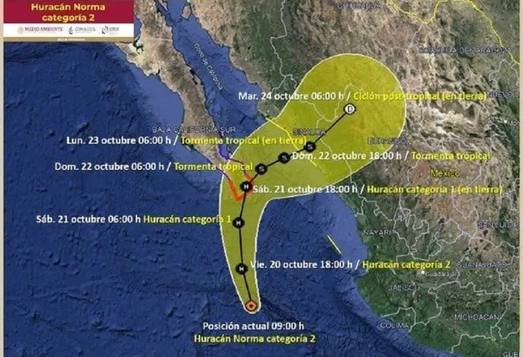 Este viernes a mediodía «Norma» regresó a categoría 3, en la escala Saffir-Simpson, su centro se localiza a 335 kilómetros al sur de Cabo San Lucas, Baja California Sur y a 425 kilómetros al oeste de Cabo Corrientes, Jalisco.