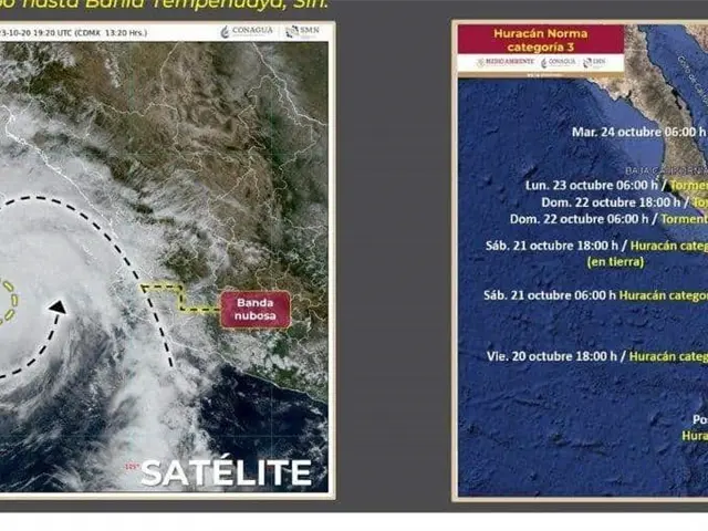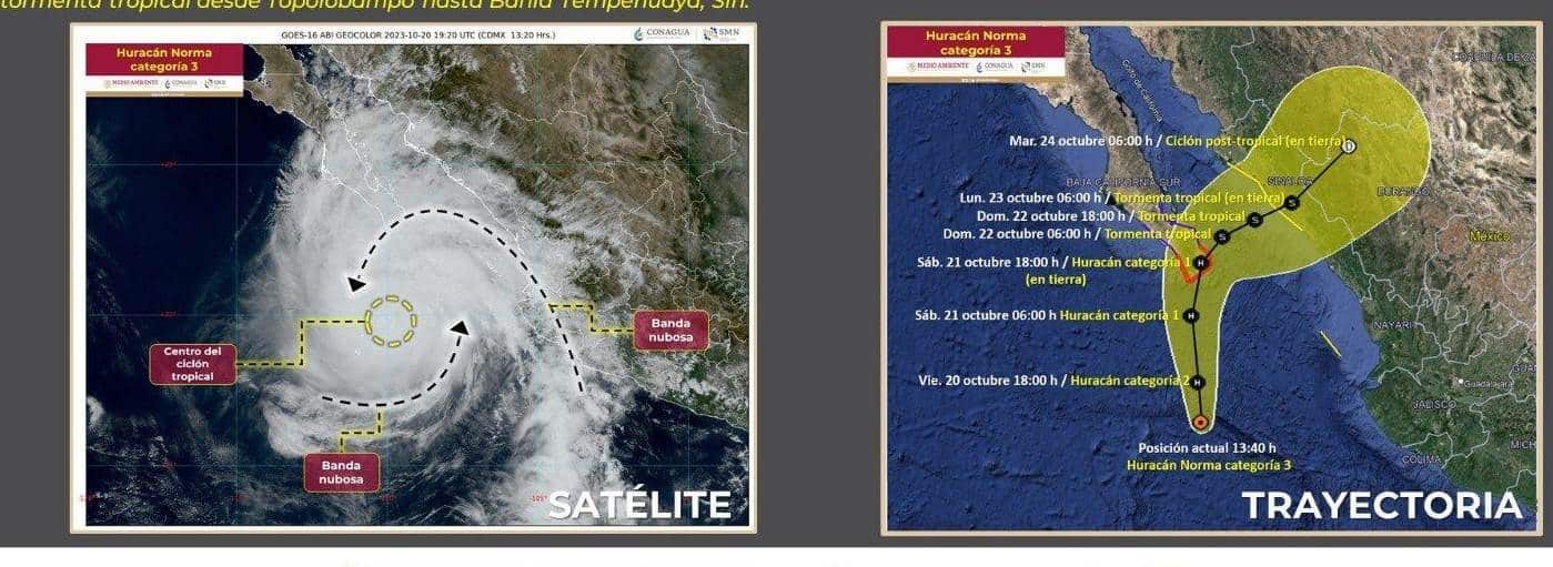 «Norma» se ha intensificado nuevamente a huracán de categoría 3 en la escala Saffir-Simpson, su centro se localiza a 335 km al sur de Cabo San Lucas, B.C.S., y a 425 km al oeste de Cabo Corrientes, Jal.