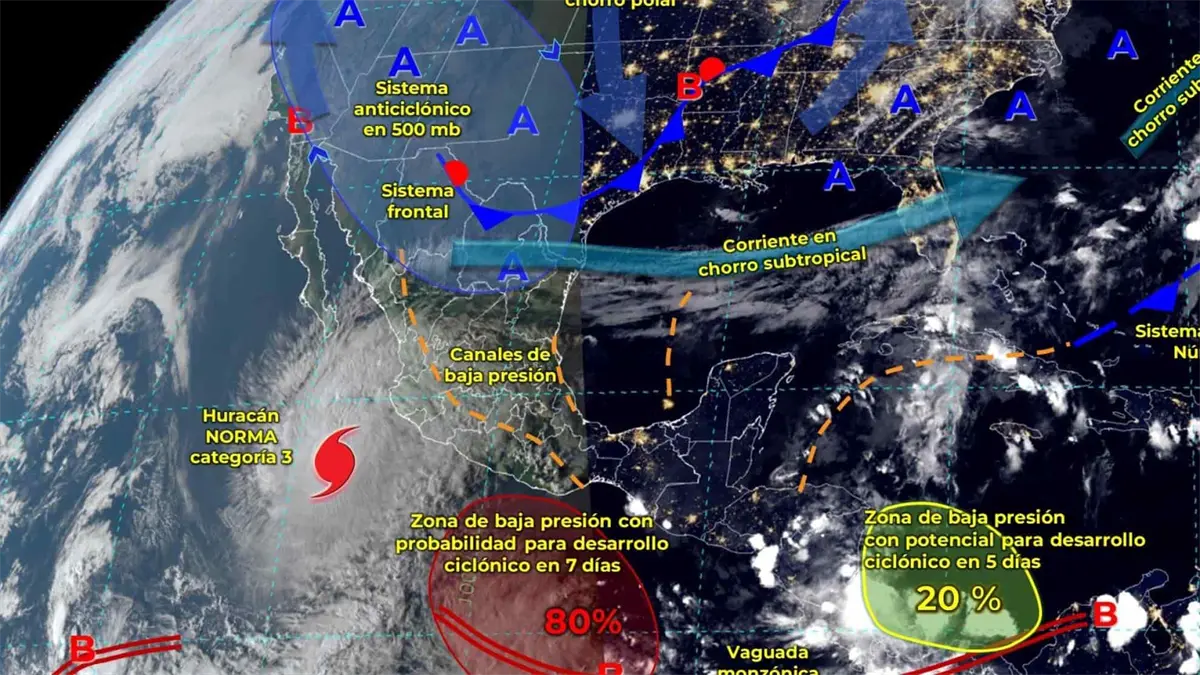 Para este viernes 20 de octubre, las bandas nubosas del huracán Norma propiciarán lluvias intensas en Sinaloa (75 a 150 mm), así como en Baja California y Nayarit.