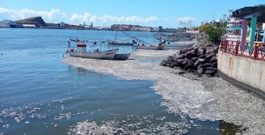 «La papa que observábamos ayer en el varadero ya se trasladó al malecón. Yo pienso que ahorita para el mediodía va a estar en la peste, pero bien fuerte son puras papas. Así le llaman los pescadores, son puras papas los que andan abolladas ahí. Y va a estar nauseabundo el olor, por lo menos 1 o 2 días, mientras el Sol azteca. Ahí le mando evidencia del cambio», indicó.
