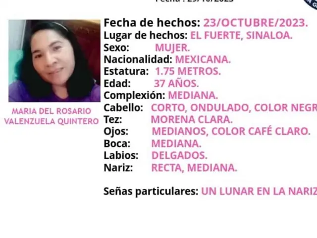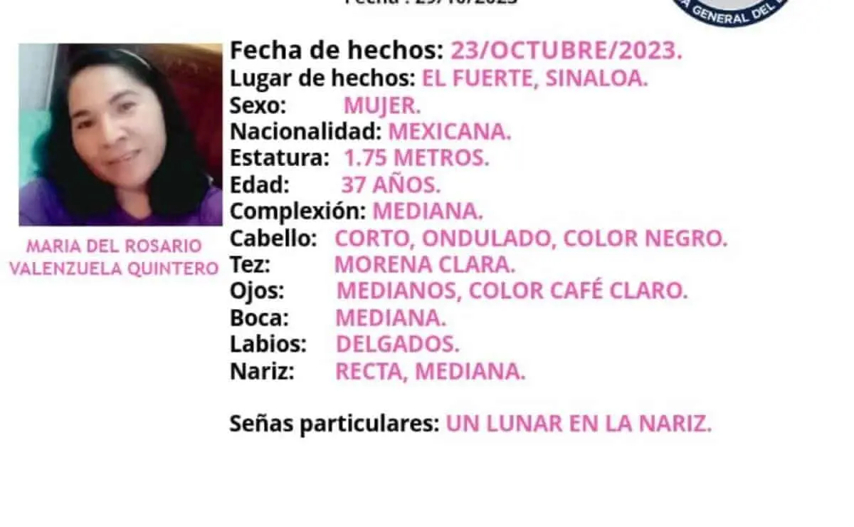 Se trata de María del Rosario Valenzuela Quintero, de 37 años de edad, quien fue vista por última vez el pasado lunes 23 de octubre, al salir de su domicilio en la comunidad de Jahuara Primero, municipio de El Fuerte.