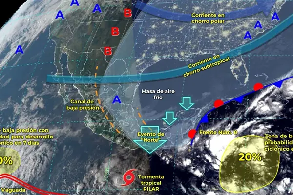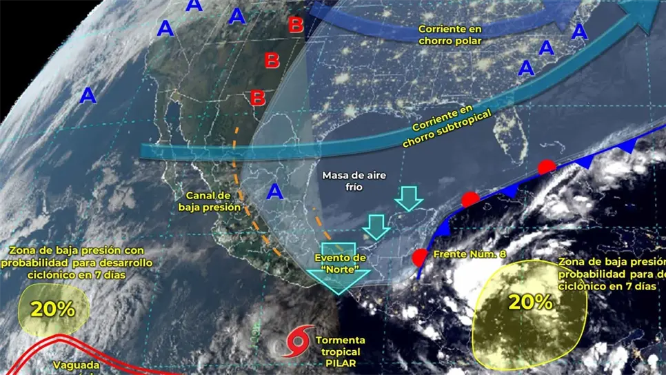 Durante la tarde-noche de este jueves 2 noviembre, así como la madrugada del viernes las bandas nubosas de la tormenta tropical Pilar, en interacción con un canal de baja presión sobre el sureste mexicano, originarán lluvias puntuales intensas en los estados de Veracruz, Tabasco y Chiapas.