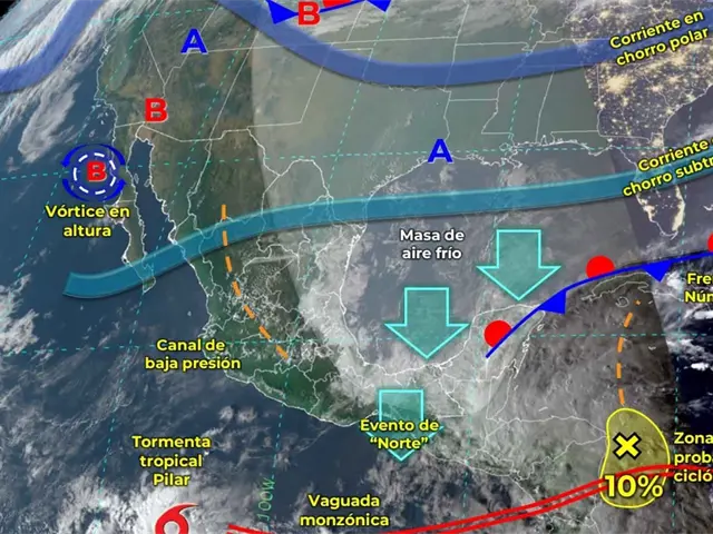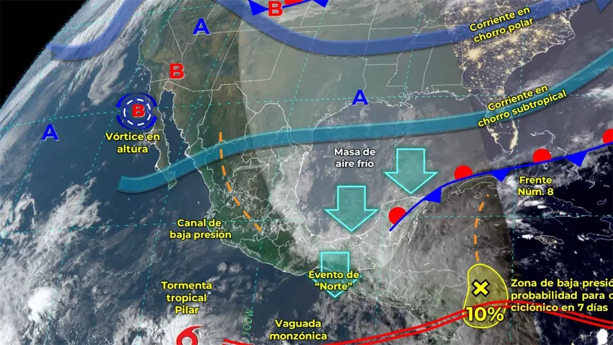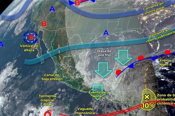 Asimismo, persistirá el evento de Norte de muy fuerte a intenso con rachas de 80 a 100 km/h y oleaje elevado de 2 a 4 metros de altura en el Istmo y Golfo de Tehuantepec, y fuerte con rachas de 40 a 60 km/h y oleaje de 1 a 2 metros de altura en las costas de Veracruz (sur), Tabasco, Campeche, Yucatán y Quintana Roo; además, bancos de niebla en el noreste, oriente y sureste del país.