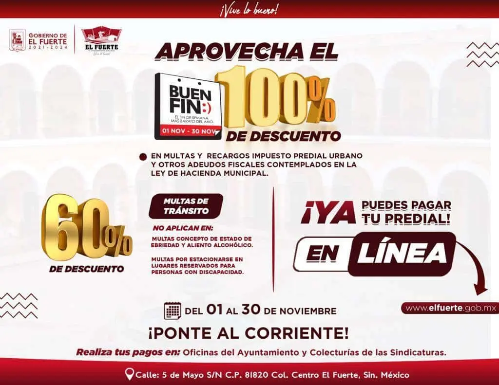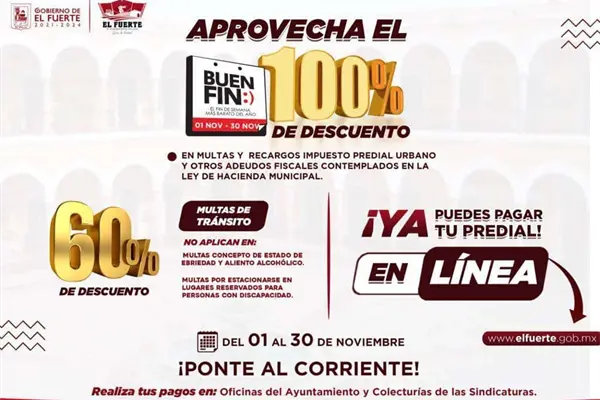 Por instrucciones del alcalde Gildardo Leyva Ortega, la Dirección de Ingresos de El Fuerte informó que por motivo del Buen Fin se aplicarán descuentos en multas y recargos por los conceptos de Predial Urbano y otros adeudos fiscales contemplados en la Ley de Hacienda Municipal, así como en infracciones de tránsito.