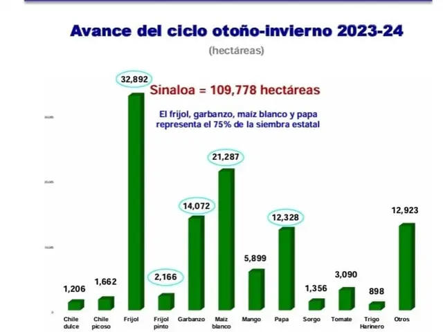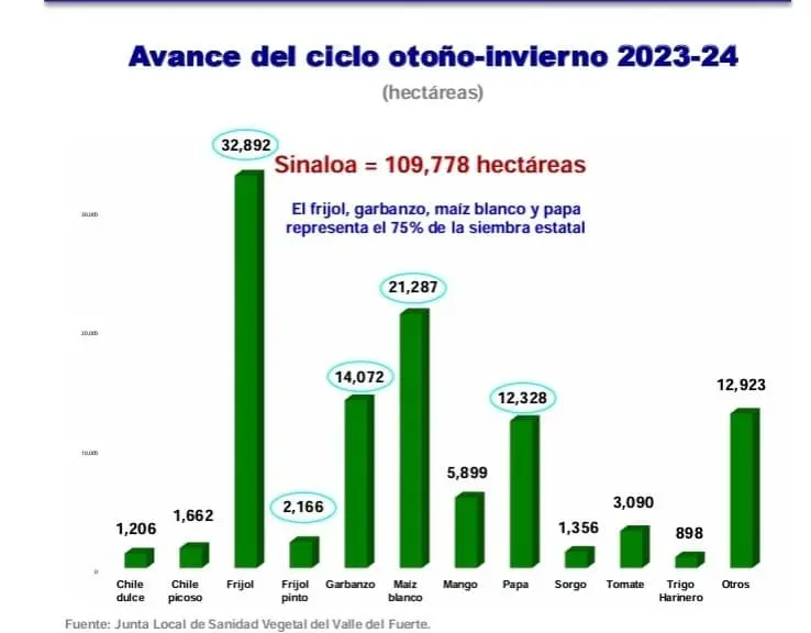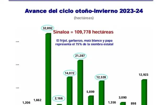 Entre los cultivos destacados está el frijol, que lidera con 32 mil 892 hectáreas, seguido por el maíz blanco, con 21 mil 287 hectáreas; el garbanzo, con 14 mil 072 hectáreas y la papa, con 12 mil 328 hectáreas.