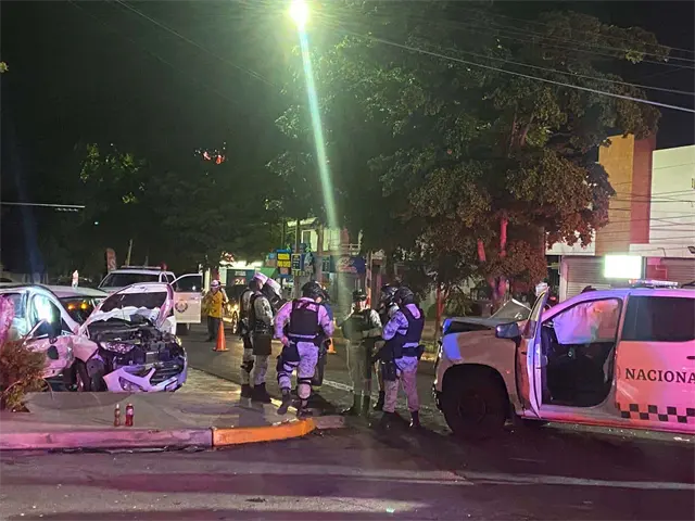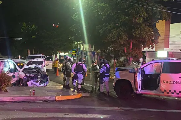 El accidente se registró alrededor de las 22:00 horas sobre el bulevar El Dorado, entre calles Gustavo Garmendia y Benito Juárez, cuando una camioneta de la Guardia Nacional se impactó contra una camioneta tipo SUV de la marca Ford, color blanco.