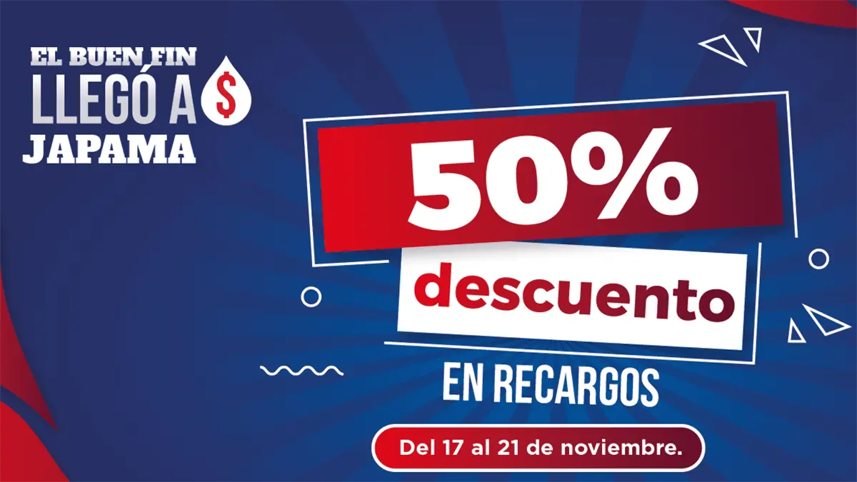 «Como ya es una práctica en los últimos años de participar con el Buen Fin, JAPAMA lo va a hacer; vamos a ofrecer el 50 por ciento de descuento en recargos para lo que es tarifa doméstica a partir del día viernes 17 hasta el martes 21; los invitamos a que acudan y que aprovechen, personas que tengan problemas de morosidad y que se les pasaron 2 o 3 mesecitos y que traen algún tema ahí de recargos, acudan y les vamos a quitar el 50 por ciento de los recargos con la liquidación del adeudo total», precisó.