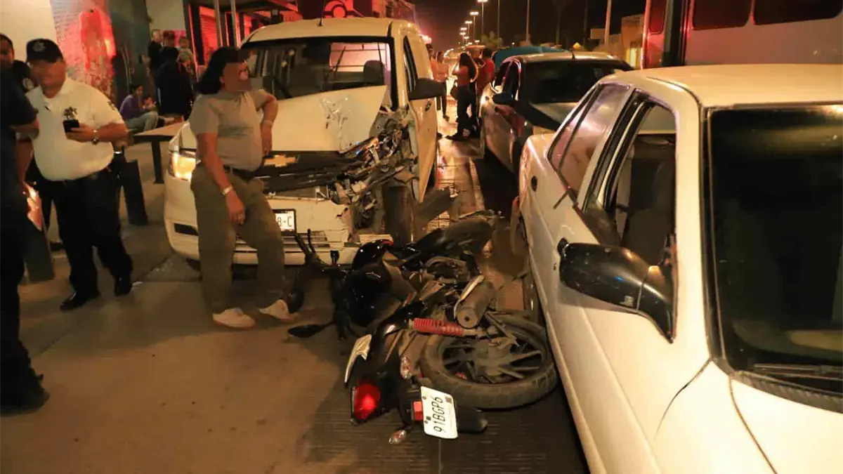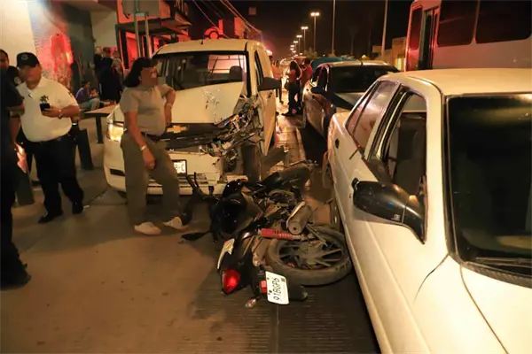 Una carambola de seis unidades registrada en la avenida Graciela Leyva, en la colonia Anahuac, deja pérdidas materiales y una mujer motociclista lesionada.
