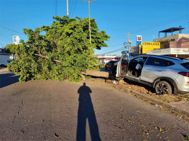 Por la fuerza del golpe derrumbó el árbol, para que este estuviera obstruyendo el carril contrario del bulevar Madero.