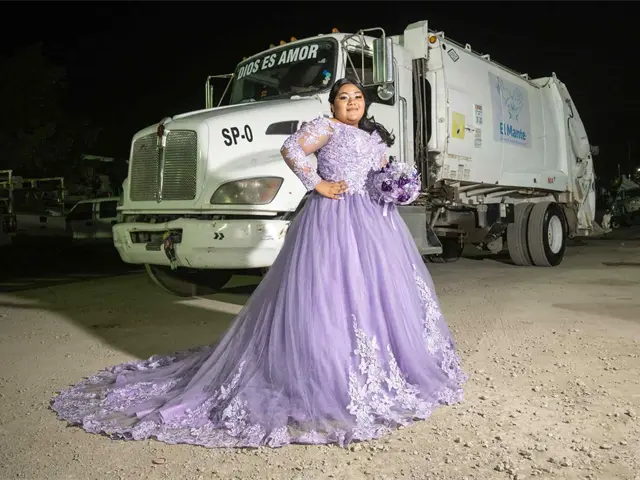 Yukari, ataviada en un elegante vestido lila, optó por incorporar a su sesión de fotos el camión de basura que simboliza el incansable trabajo de su amado padre.
