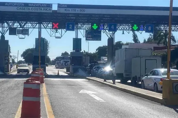 Se registran largas filas en casetas de cobro de distintos tramos carreteros en Sinaloa, automovilistas están esperando aproximadamente 10 minutos para pagar su peaje y continuar circulando.