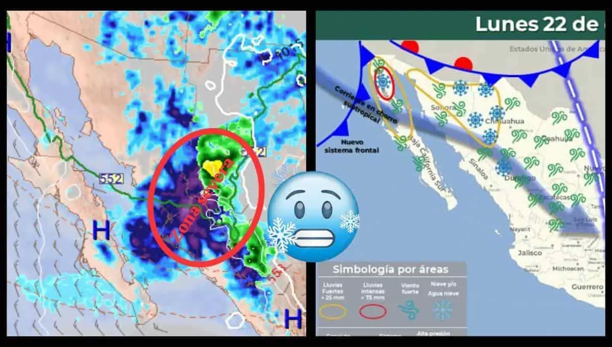 Asimismo, mantendrán las condiciones para la caída de nieve o aguanieve en sierras de Sonora, Chihuahua, Durango y Sinaloa (sierra norte).