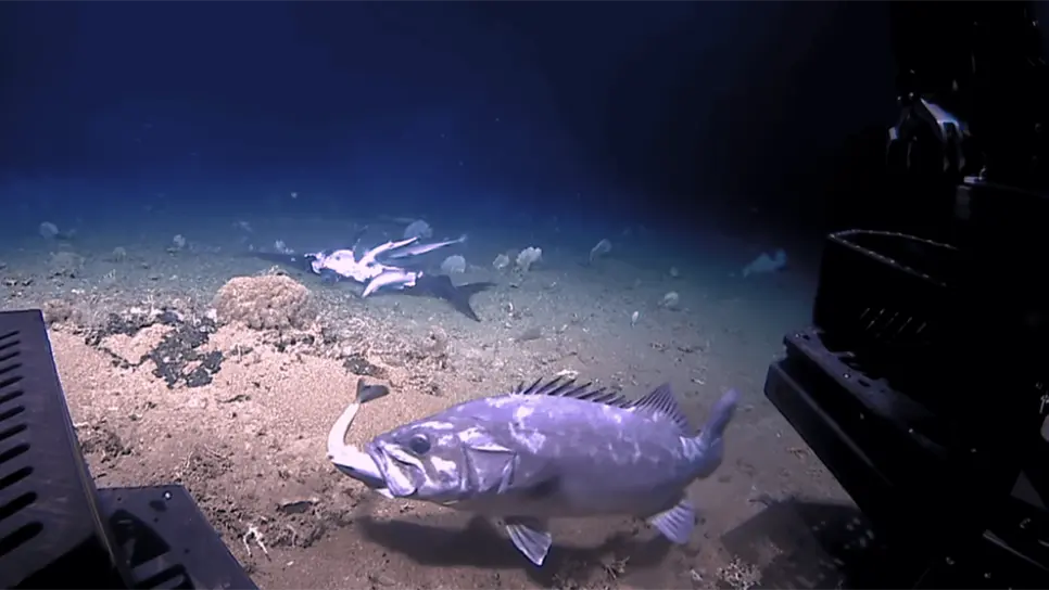 En una expedición de investigación submarina realizada por la Oficina de Exploración e Investigación Oceánica de la NOAA frente a las costas de Carolina del Sur, los científicos se encontraron con una escena sorprendente: un mero gigante devorando un tiburón que, a su vez, se alimentaba de un pez espada.