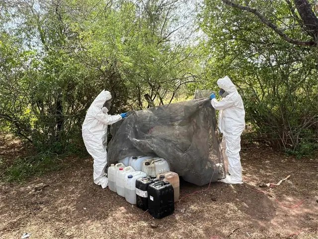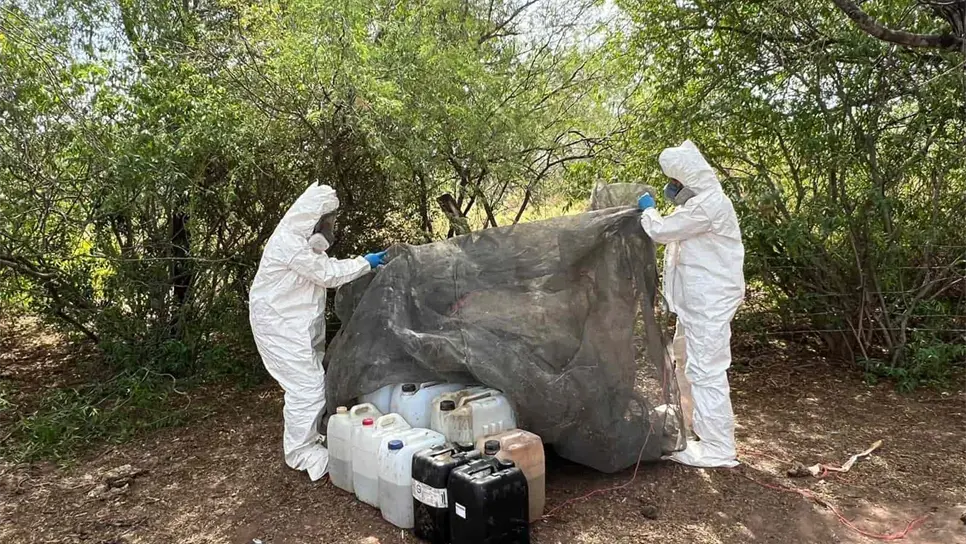 Elementos del Ejército aseguraron más de media tonelada de metanfetamina y más de dos mil litros de sustancias químicas para elaborar droga sintética en los poblados de La Constancia, San Miguel de las Mesas y Solidaridad Campesina.