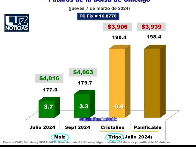 Los futuros de maíz a julio del 2024 ganaron 3.7 dólares para ubicarse en 177 dólares, lo que significa un precio de referencia de $4 mil 016 por tonelada de maíz (considerando la BASE de 61 dólares propuesta por SEGALMEX), mientras que los futuros de maíz a septiembre del 2024 subieron 3.3 dólares para ubicarse en 179.7 dólares, lo que representa un precio de $4 mil 063 por tonelada.