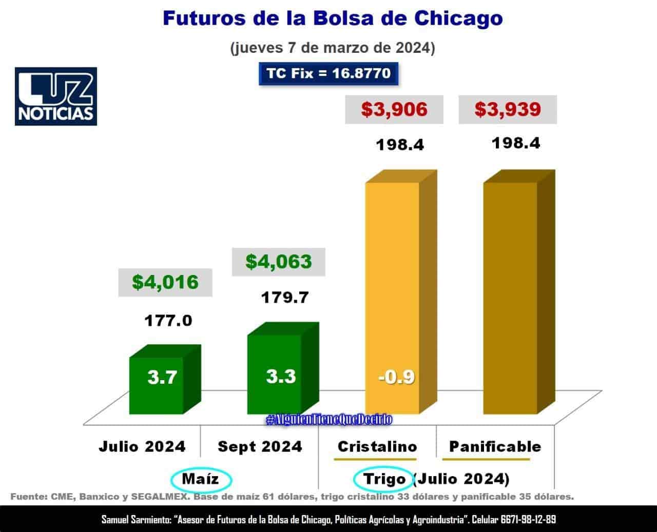 Por otra parte, los futuros de trigo a julio del 2024 perdieron 0.9 dólares para ubicarse en 198.4 dólares, lo que significa un precio de referencia de $3 mil 906 por tonelada de trigo cristalino y de $3 mil 939 por tonelada de trigo panificable (considerando las BASES de 33 y 35 dólares propuestos por SEGALMEX para Sinaloa).