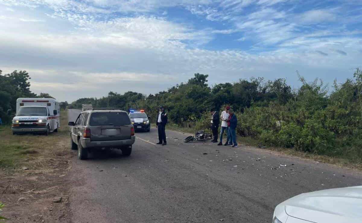 Cuando el camión giró hacia el poblado de Caimanes, el motociclista cambió de carril sin percatarse de la presencia de una camioneta que se aproximaba en dirección contraria, lo que provocó que las unidades se impactaran de manera frontal.