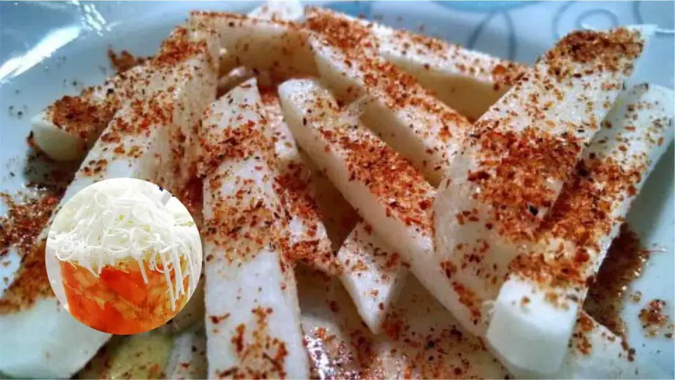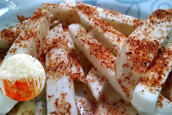 Este peculiar platillo es una opción perfecta para los días de calor, gracias a su frescura y su combinación de ingredientes refrescantes. Consiste en una mezcla de jícama, cebolla, limón, chile, vinagre y queso rallado, que resulta en una explosión de sabores en cada bocado.