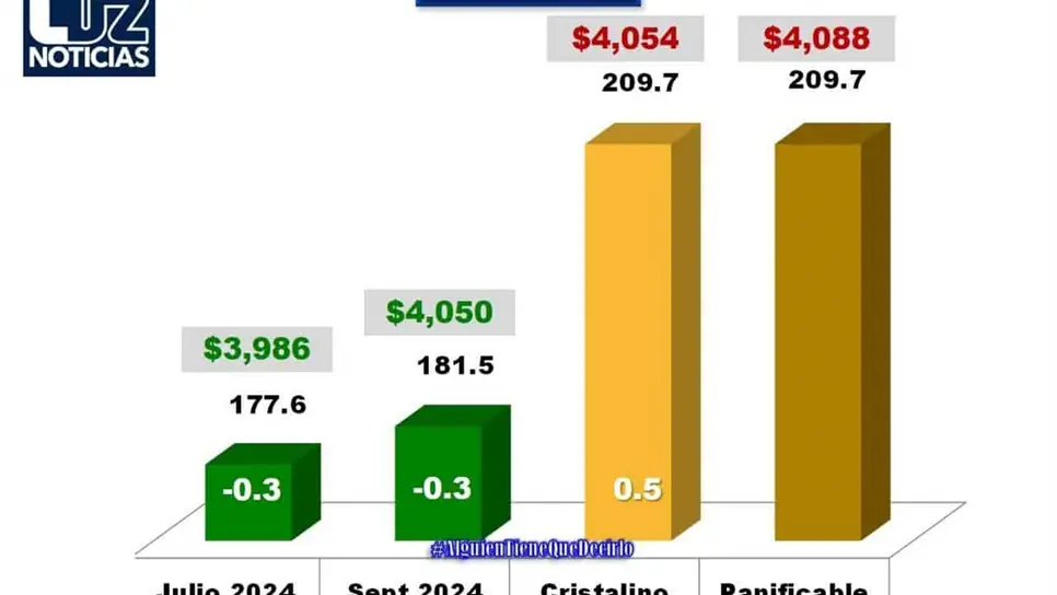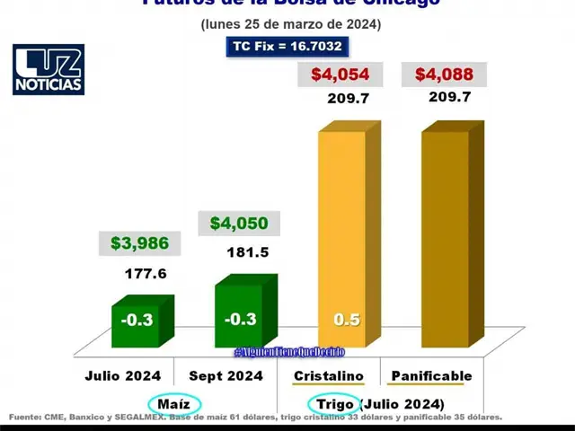 Por otra parte, los futuros de trigo a julio del 2024 ganaron 0.5 dólares para ubicarse en 209.7 dólares, lo que significa un precio de referencia de $4 mil 054 por tonelada de trigo cristalino y de $4 mil 088 por tonelada de trigo panificable (considerando las BASES de 33 y 35 dólares propuestos por SEGALMEX para Sinaloa).