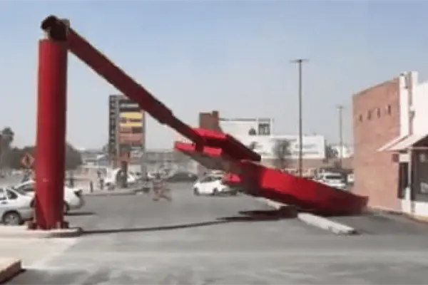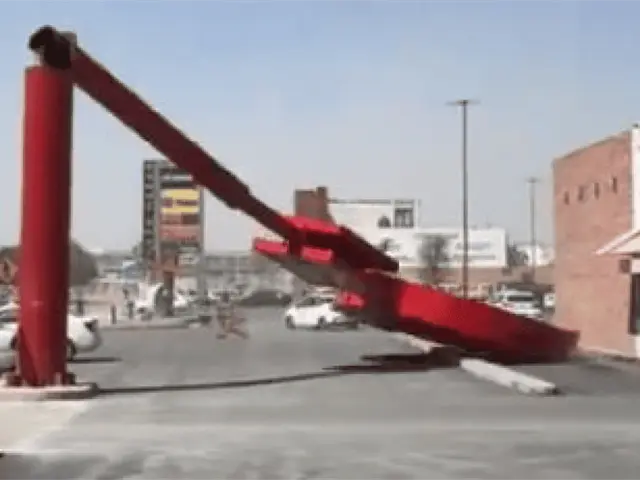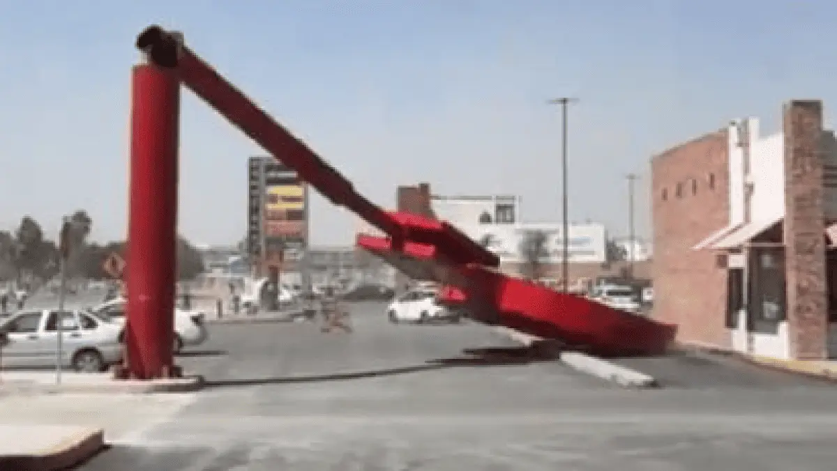 El hecho fue captado en video y compartido a través de redes sociales y se observa el momento exacto en el que la base del espectacular se parte por la mitad y cede a la fuerza de los vientos.