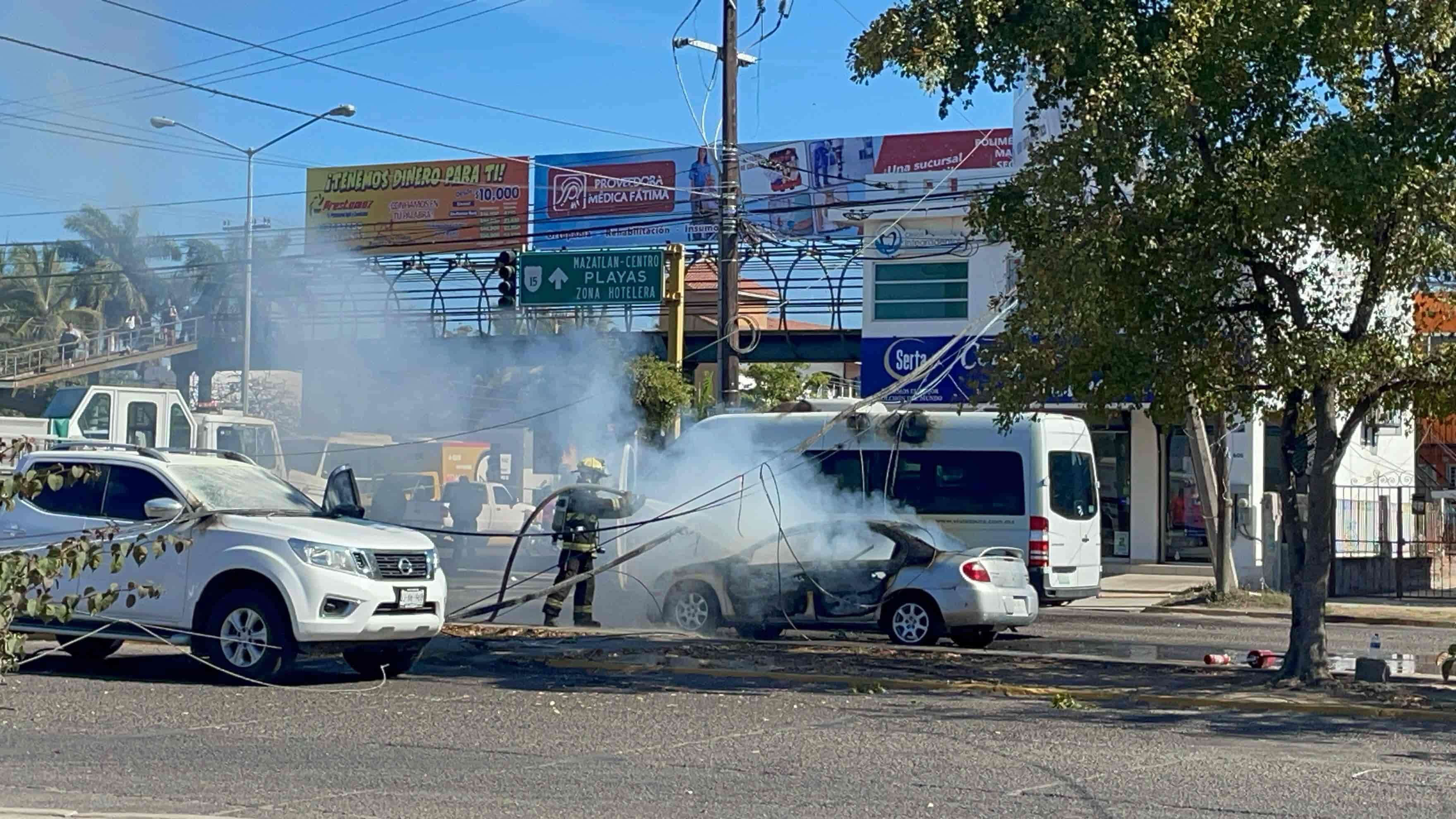 Se incendian tres vehículos luego de qué grúa provoca caída de poste de luz en Mazatlán