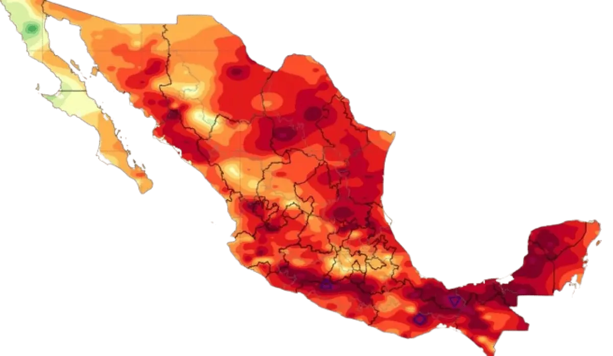 - Temperaturas máximas de 35 a 40 °C: Baja California, Baja California Sur, Chihuahua, Zacatecas, Aguascalientes, Guanajuato y Estado de México (suroeste).
