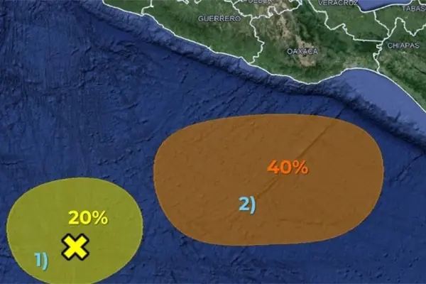 La segunda zona de inestabilidad atmosférica se encuentra frente a las costas de Guerrero y Oaxaca, con un 40 % de probabilidad de desarrollo ciclónico en los próximos siete días.