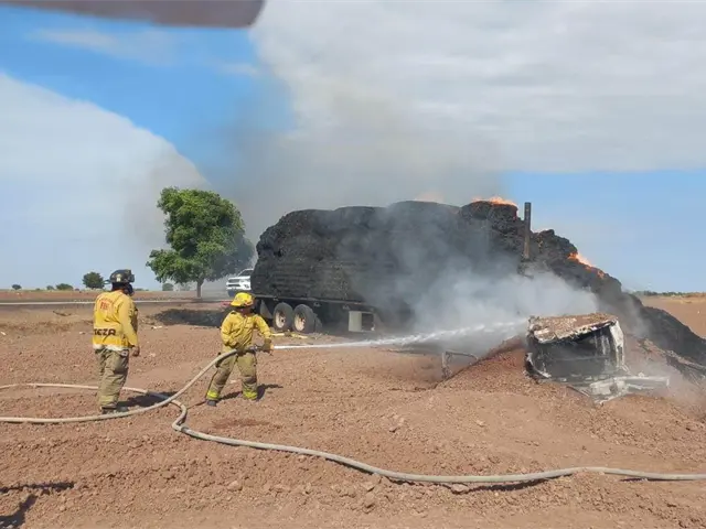 Los bomberos trabajaron arduamente para controlar y sofocar el incendio que amenazaba con extenderse debido a la carga de pacas de maíz.