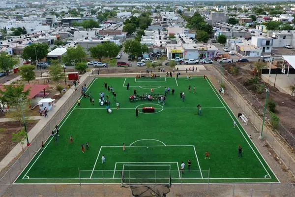 El espacio deportivo que se entregó es una cancha de futbol que cuenta con pasto sintético, barda perimetral, alumbrado público y porterías totalmente nuevas.