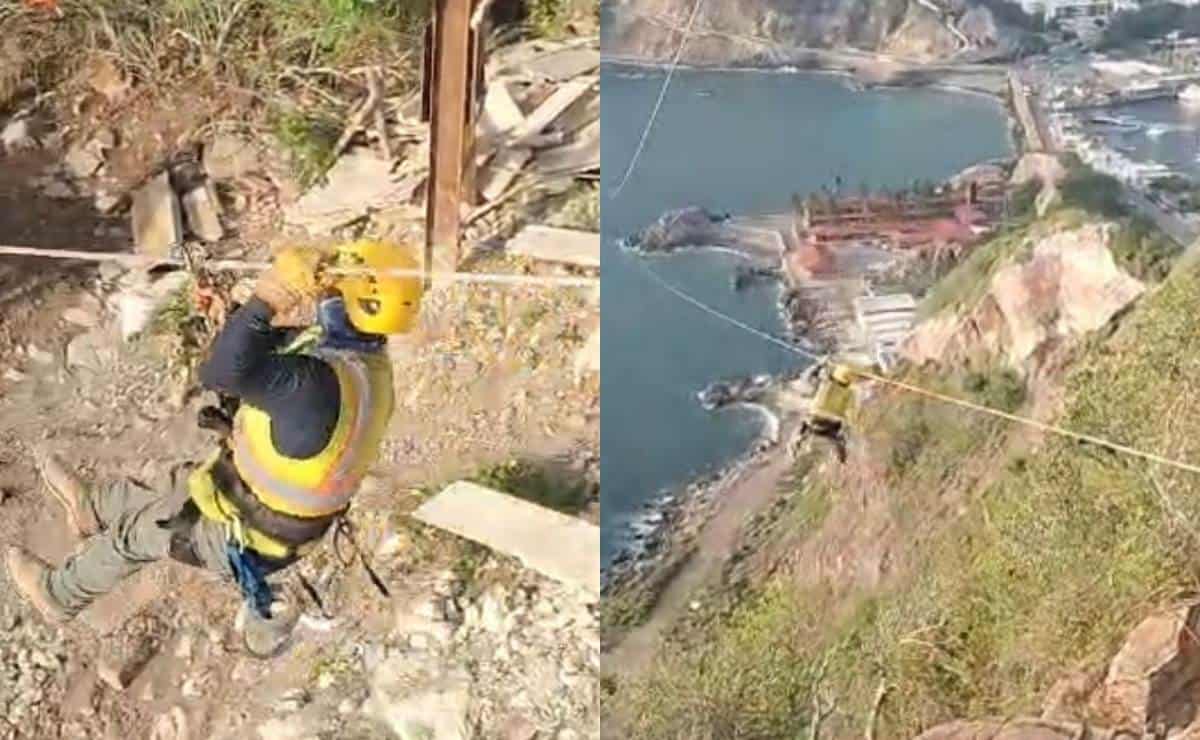 En un video compartido este martes, se aprecia cómo un trabajador, de quienes realizan la instalación, se avienta por el largo cable, haciendo las primeras pruebas de resistencia.