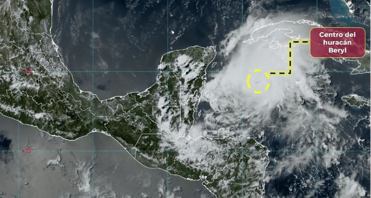 En punto de las 15:00 horas de este jueves, el huracán Beryl de categoría 2 se localizaba a 320 km al sureste de Cancún, Quintana Roo y a 345 km al este-sureste de Tulum, Quintana Roo, con trayectoria hacia la Península de Yucatán.