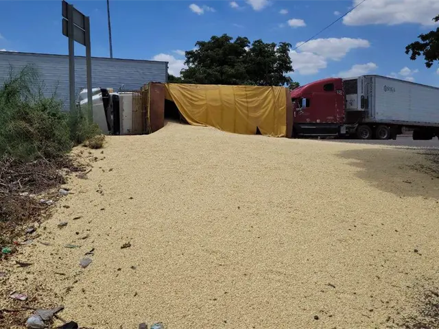 La pesada unidad volcó, derramando casi la totalidad del maíz que transportaba.