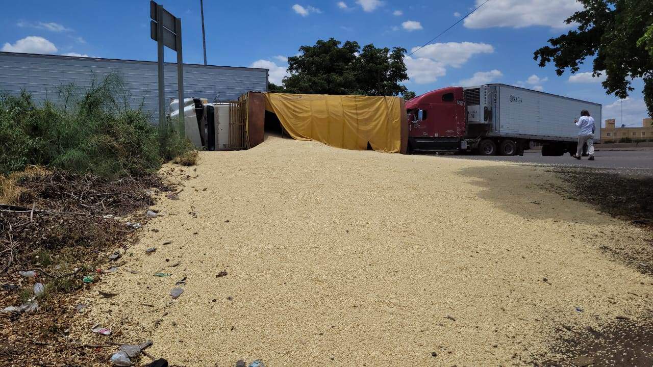 Un camión tipo torton que transportaba 17 toneladas de maíz volcó sobre la carretera internacional México 15, en la zona conocida como «La Japonesa» en la ciudad de Los Mochis durante el medio día de este jueves.