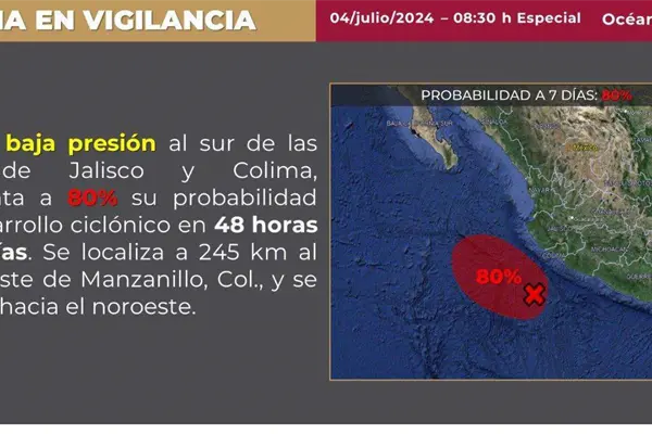 «La zona de baja presión se localiza a 245 km al sur-suroeste de Manzanillo, Colima, y se desplaza hacia el noroeste». Esta trayectoria ha generado una atención especial debido a su potencial impacto en las zonas costeras y las condiciones meteorológicas adversas que podría desencadenar.