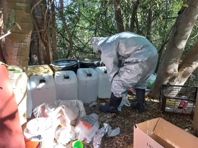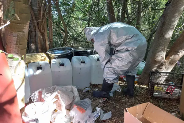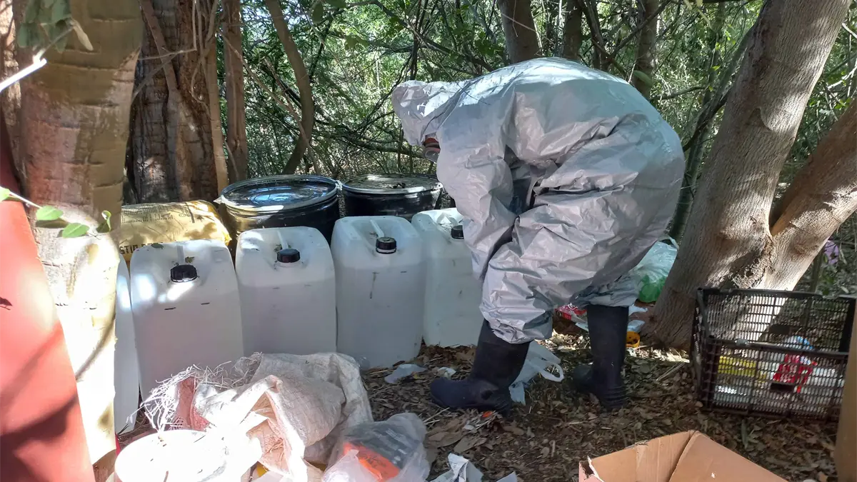 Decomisaron 50 kilogramos de marihuana incinerada y material para la presunta fabricación de droga, como 9 mil 930 litros de precursores químicos, 25 áreas de almacenamiento de precursores químicos y 8 reactores utilizados para la confección de droga sintética.