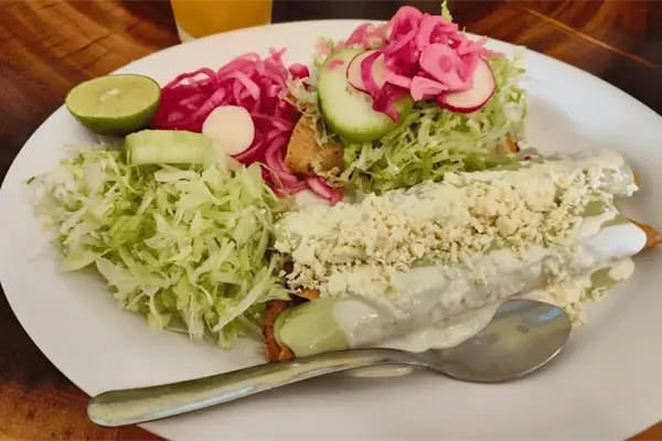 Ahí encuentras menudo, pozole, la tradicional sopa azteca (carne o pollo), y tampoco pueden faltar las gorditas, tostadas de carne o pata, tacos dorados y flautas, estas de carne, pollo, y las que sin duda debes probar son las de tres quesos.