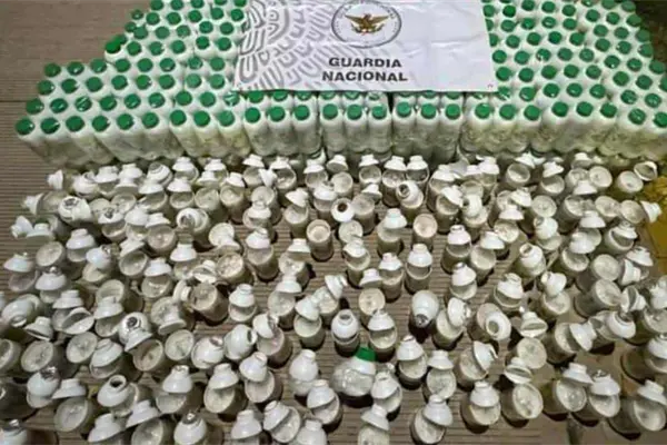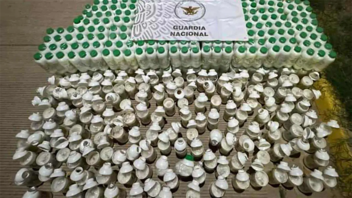Tras un operativo que realizó la unidad Canina de la Guardia Nacional, se logró el aseguramiento de 144 bolsas de plástico con peso estimado de 65 kilogramos de posible metanfetamina, las cuales estaban ocultas en botellas que simulaban contener un producto para limpieza.