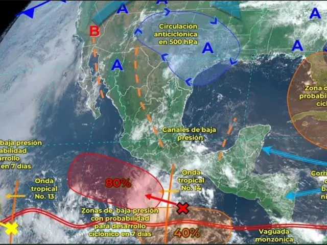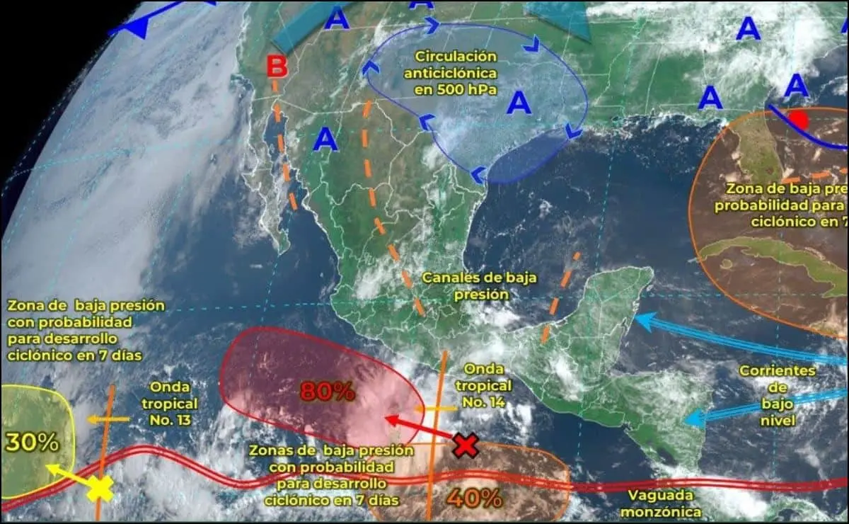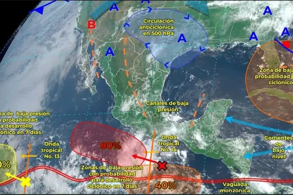 La onda tropical No. 14 se desplazará sobre el centro y sur del territorio nacional, asociada con una zona de baja presión con probabilidad de desarrollo ciclónico al sur de las costas de Guerrero.