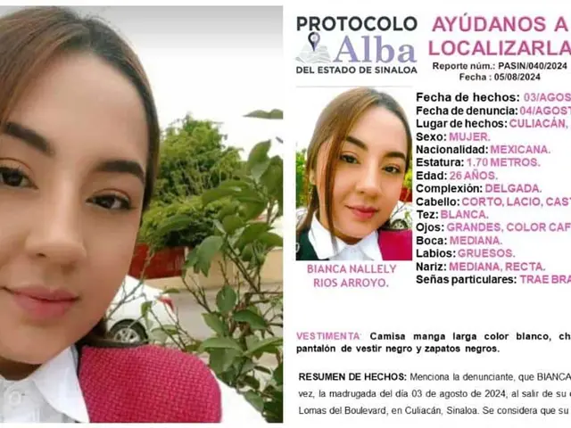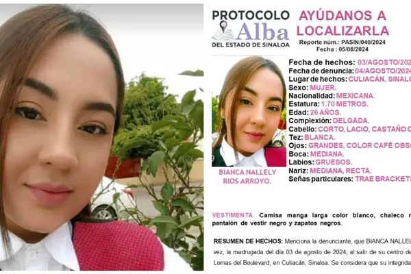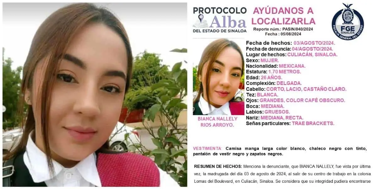 La Fiscal General del Estado (FGE), a través del Protocolo Alba, solicita la colaboración de la ciudadanía para localizar a Bianca Nallely Ríos Arroyo, joven desaparecida en Culiacán, Sinaloa.