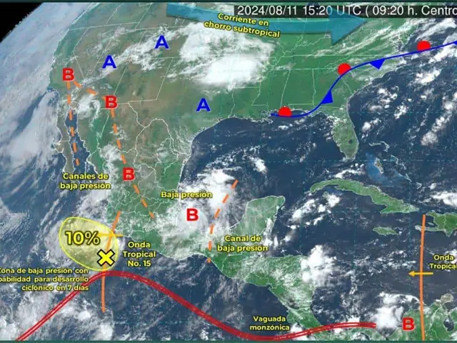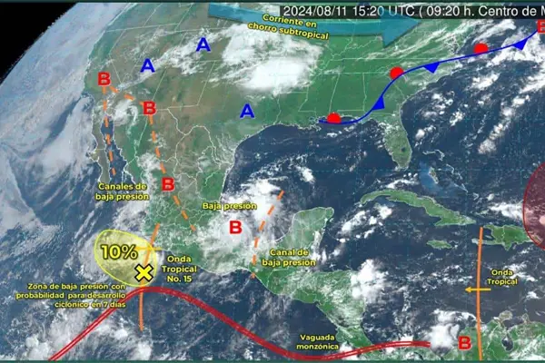 De nueva cuenta el monzón mexicano en combinación con divergencia en altura, ocasionarán probabilidad de lluvias fuertes a muy fuertes acompañadas de descargas eléctricas y posible caída de granizo, además de rachas fuertes de viento con posibles tolvaneras en el noroeste de la República Mexicana, así como chubascos en la península de Baja California.